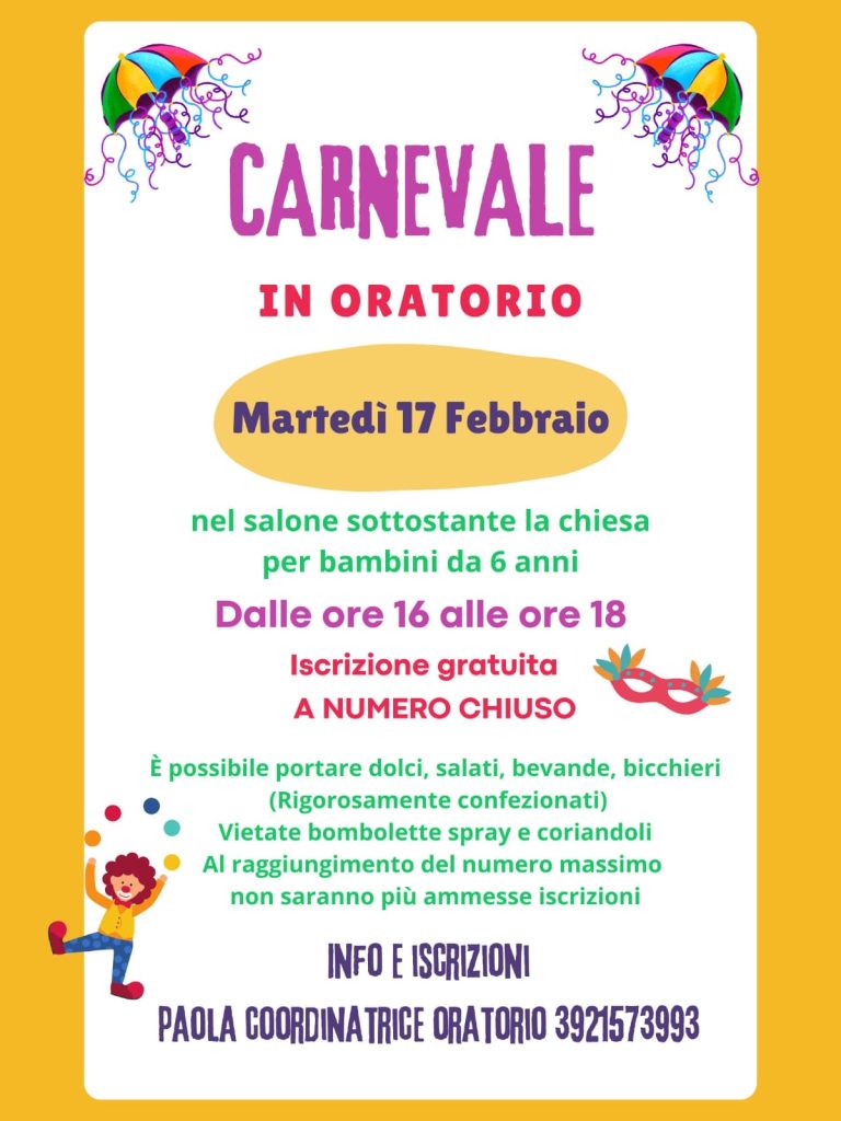 Carnevale in oratorio, martedì grasso 17 febbraio dalle ore 16 alle 18: la locandina.