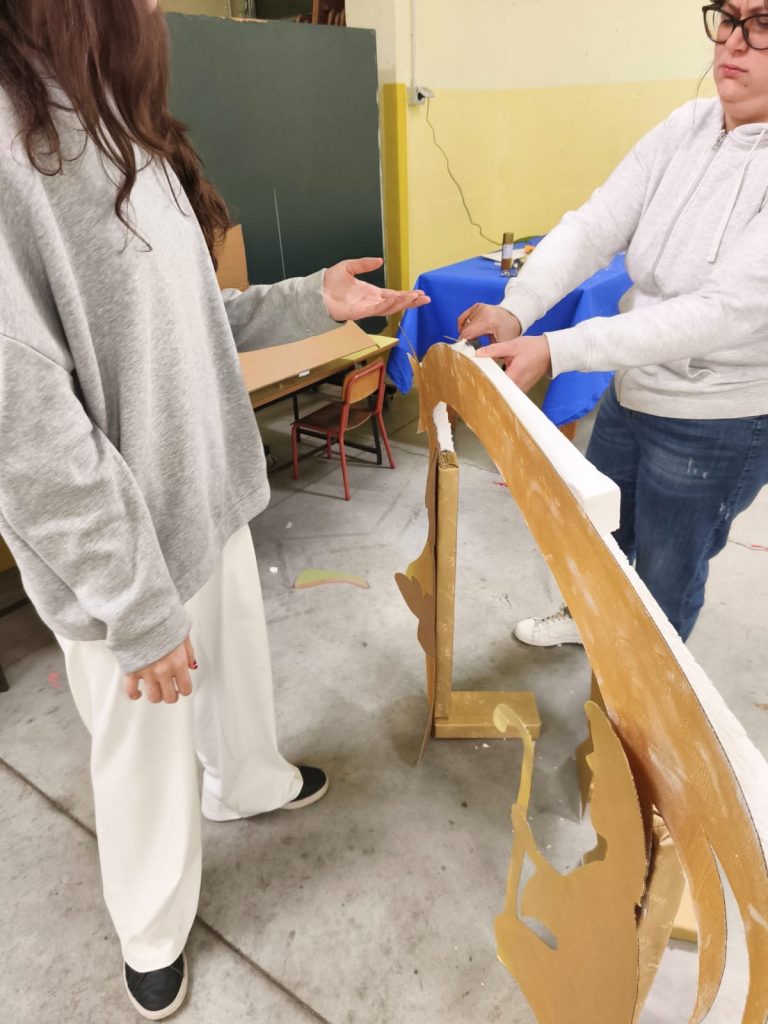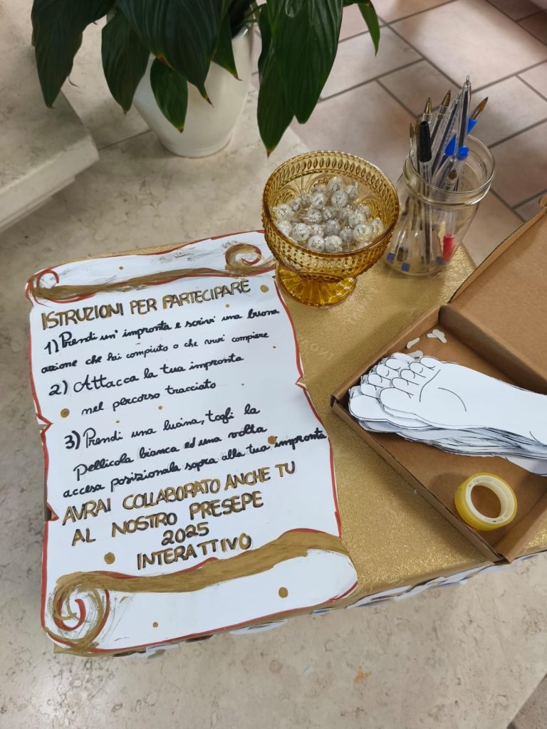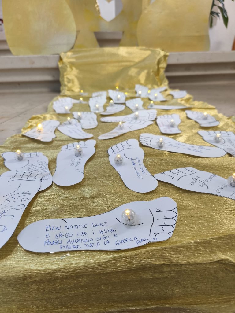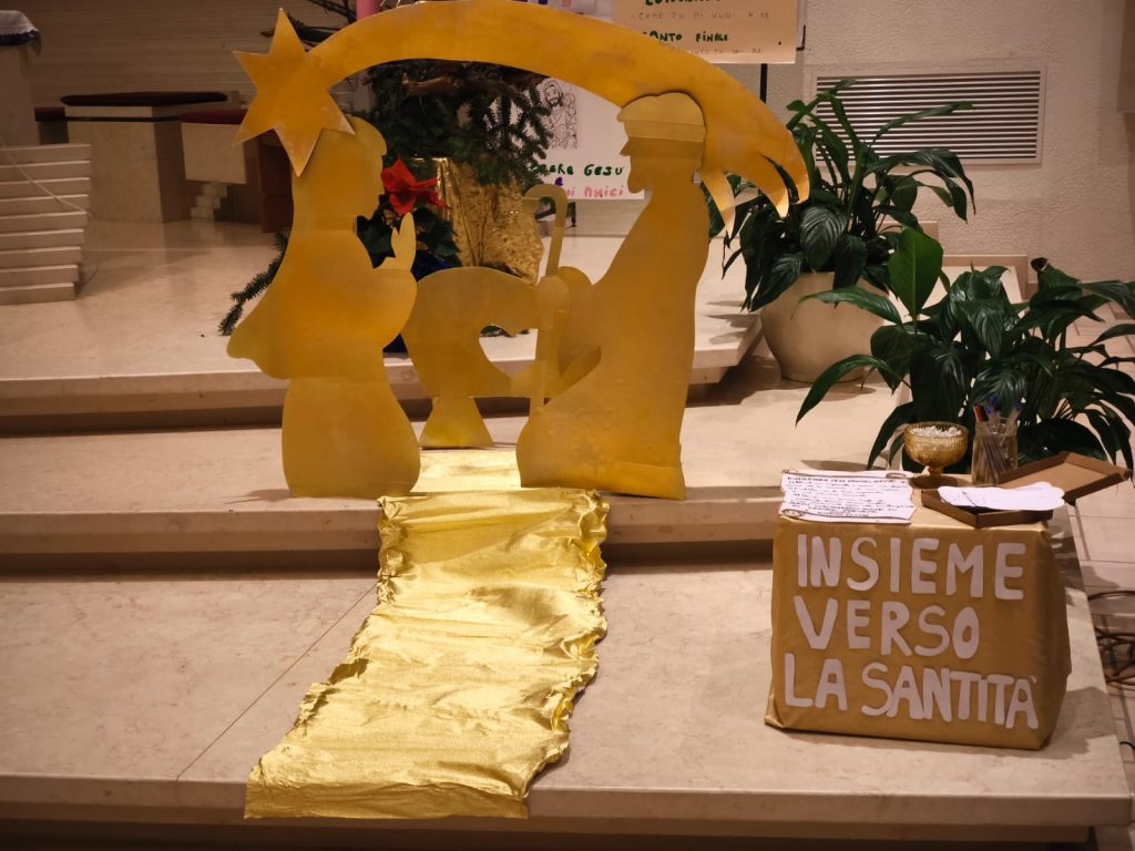 La comunità ci ha aiutato con il recupero di scatoloni, stoffe ed altri oggetti utili alla creazione del Presepe. Abbiamo realizzato una natività stilizzata con il cartone e colorata con bombolette spray Oro.