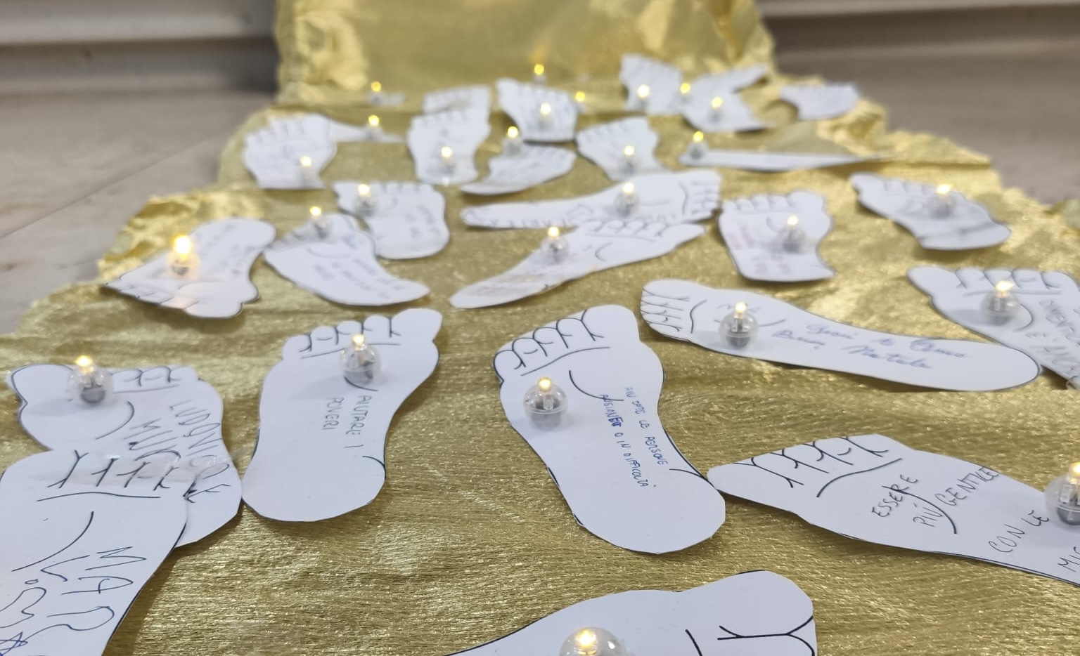 I passanti infatti potevano scrivere una buona intenzione sopra l’impronta e poi accendere una lucina e posizionarla nella strada tracciata simbolo del loro impegno verso la Santità. Così abbiamo ideato il titolo: INSIEME VERSO LA SANTITA’… perché proprio riprendendo il motto del nostro Oratorio: È più Bello Insieme!”