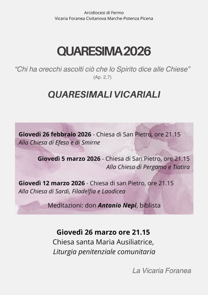 2,7). Don Tonino Nepi, presbitero della diocesi di Fermo, apprezzato docente di Sacra Scrittura, guiderà 3 meditazioni che si svolgeranno nella chiesa di San Pietro dalle 21,15. Questi i temi trattati: giovedì 26 febbraio: “Alla Chiesa di Efeso e Smirne”; giovedì 5 marzo: “Alla Chiesa di Pergamo e Tiatira”; giovedì 12 marzo: “Alla Chiesa di Sardi, Filadelfia e Laodicea”.